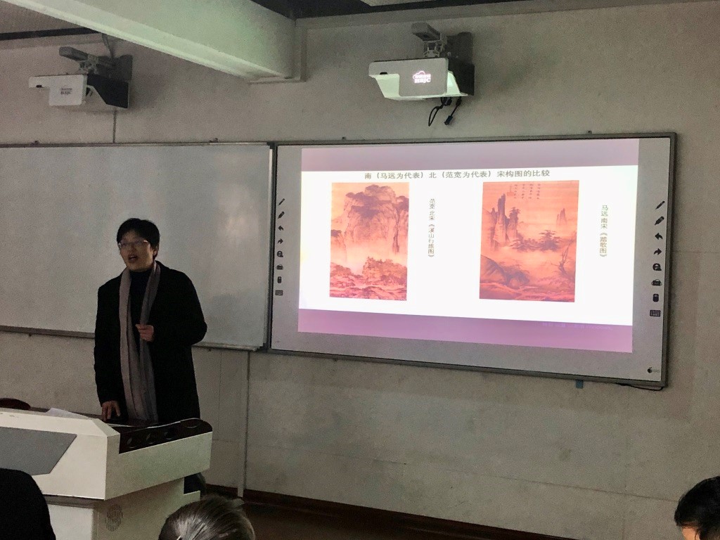 郑文副教授在讲解中国山水画的鉴赏方法时,将国外美术鉴赏教学方法巧妙地运用到山水画作品的鉴赏过程之中,并以范宽的《溪山行旅图》和马远的《踏歌图》为例,进行详细的比较分析,为教师们在日常课堂教学中较难开展的山水画鉴赏教学做了理论指引和实践指导。
