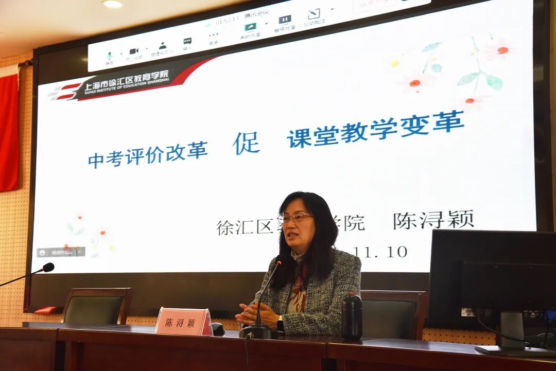 徐汇区初中物理教研员陈浔颖老师带来题为《中考评价改革 促课堂教学变革》的讲座。她借助近年来的中考试题,详细剖析试题考查背后的目标,以及所折射的学科核心素养;通过课例说明如何在教学中将学科核心素养、课程标准内化到单元目标,再从单元目标细化到课时目标,进而从课时目标落实为活动目标。