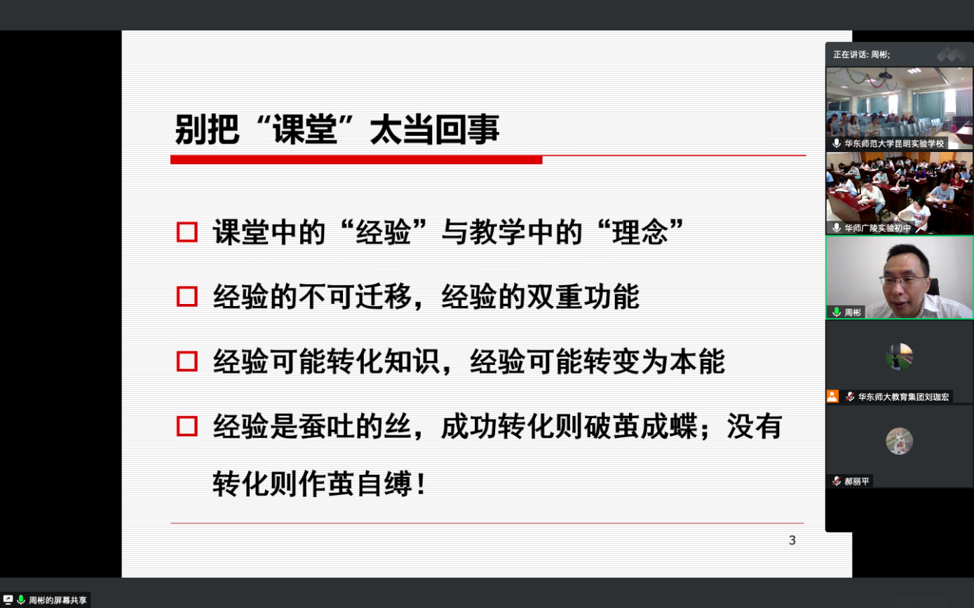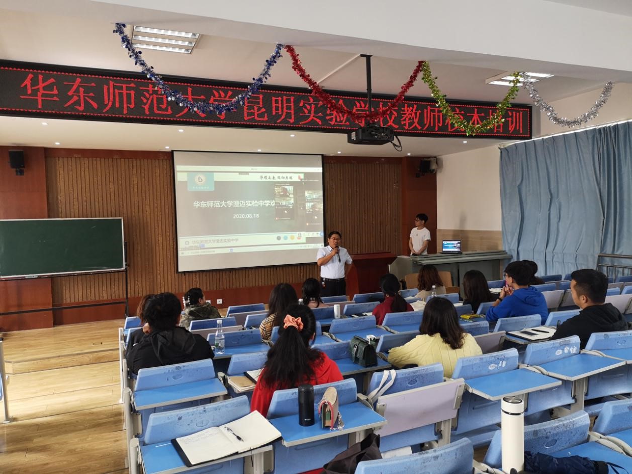 为贯彻党的教育方针,落实立德树人根本任务,加强华东师大附属(实验)学校教师队伍建设,提升师资队伍质量,2020年8月17日至21日,华东师大教育集团组织开展2020年新教师岗前培训。本次培训采用云端和线下、集中培训和校本培训结合的方式进行,邀请华东师范大学档案馆馆长汤涛、教师教育学院院长周彬、教育学部副主任柯政、教育学部副教授刘竑波四位专家作专题讲座,邀请教育部中学校长培训中心副教授万恒、华东师大澄迈实验中学校长张喜忠、华东师大二附中前滩学校校长洪燕芬等专家作校本培训讲座。