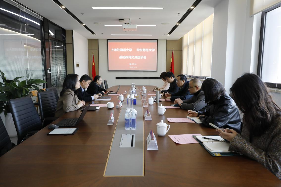 3月11日,上海外国语大学基础教育与终身教育管理办公室处长兼上海外国语大学附属浦东外国语学校书记李仁东一行到校交流基础教育办学工作。华东师大基础教育处处长李志聪、副处长华春燕、办公室主任郝丽平出席座谈。