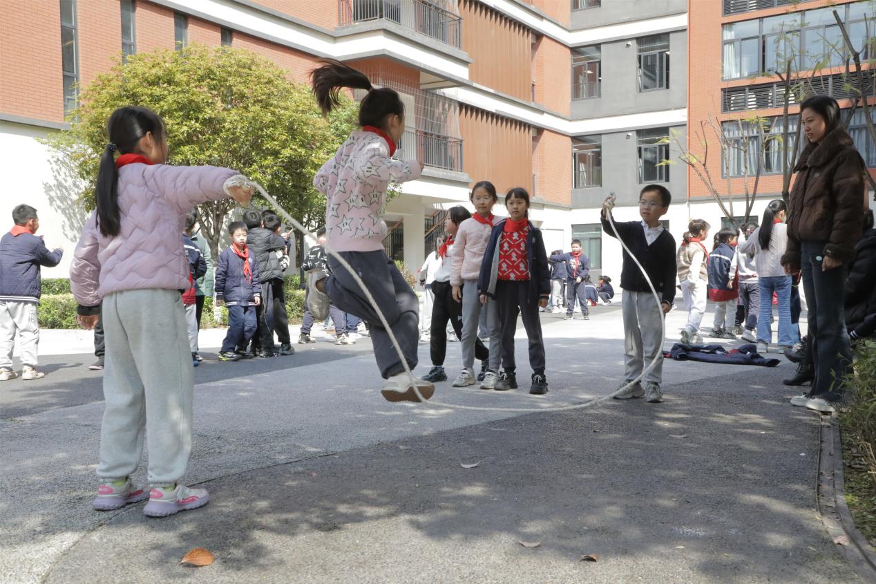 在华师中旭,每个学生都有这样一张全天候的运动菜单:8点开始晨跑,上午10点韵律操大课间,课间以及午后游戏活动,15点传统游戏大课间、16点开始体育选修......加上每日体育课,户外运动远超2小时。