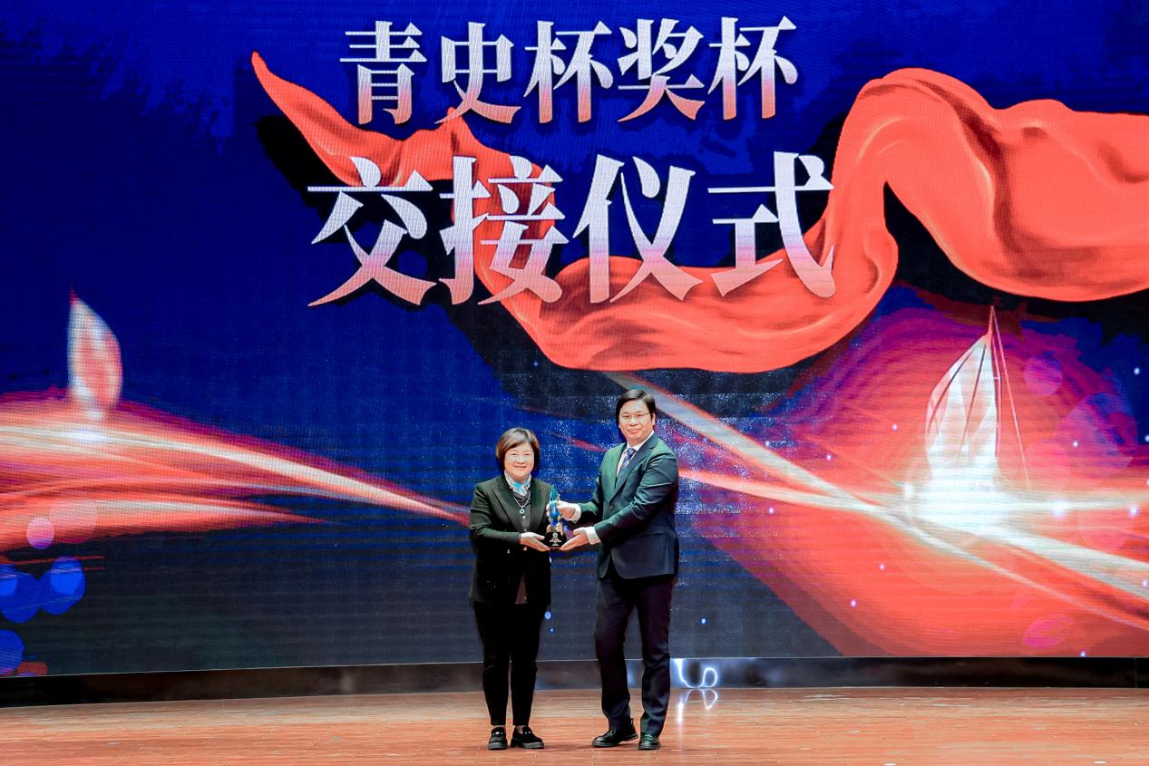在庄重的交接仪式中,复旦大学附属复兴中学党总支书记邬文敏将象征“时代、史学、青年”的水晶杯转交至第十一届“青史杯”闭幕式承办方代表、上海市浦东中学校长吴晓勤,寓意赛事精神薪火相传、生生不息。