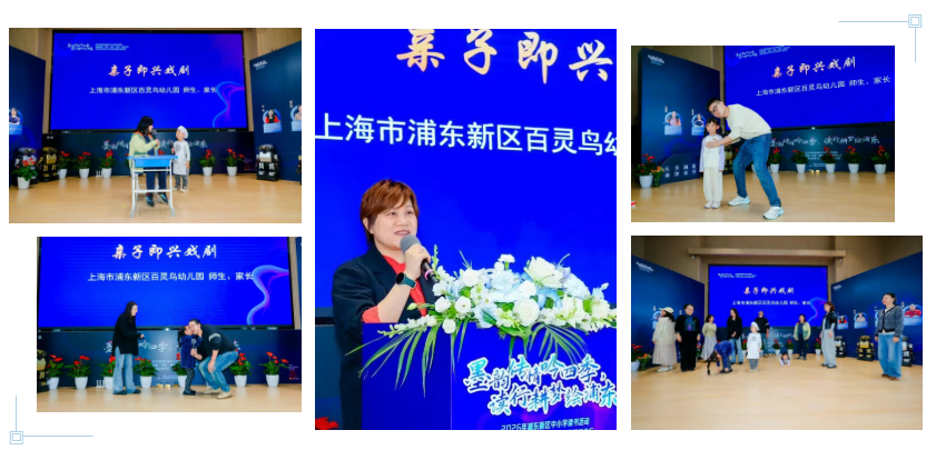当天,上海市百灵鸟幼儿园的老师、家长和孩子们带来了一场特别的亲子即兴戏剧表演,三组家庭在无剧本情境中自由共创,以《神奇的餐厅》《马戏团》等展现阅读育人的生活化实践。孩子们的可爱表达与亲子间默契配合,感染了在场的老师。
