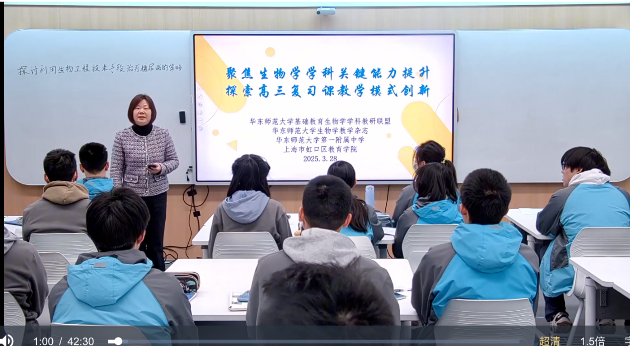 3月28日,基础教育学科教研联盟生物组在华东师范大学第一附属中学举办了主题为“聚焦生物学学科关键能力,探索高三复习课教学模式创新”教研活动。本次活动围绕高三生物复习课的教学创新展开,旨在通过主题式单元化知识结构重构和“问题链-任务群”教学模式,提升学生在复杂科研情境中的生物学关键能力,推动核心素养导向的高效复习模式发展。活动吸引了来自全国各地的教师参与,线上、线下累计观看人数达1860人。
