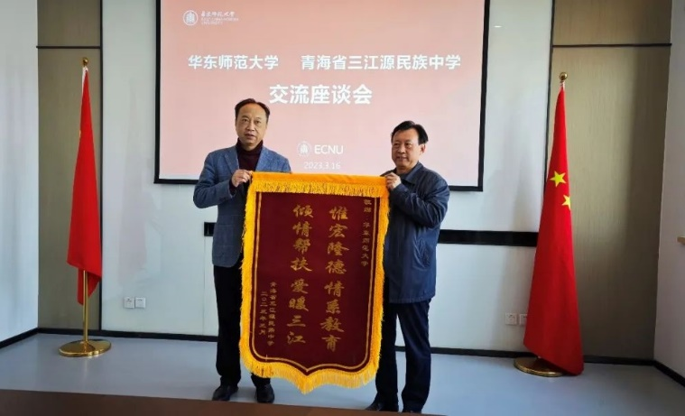 ▲青海三江源民族中学来沪座谈交流,并向华东师大赠送锦旗