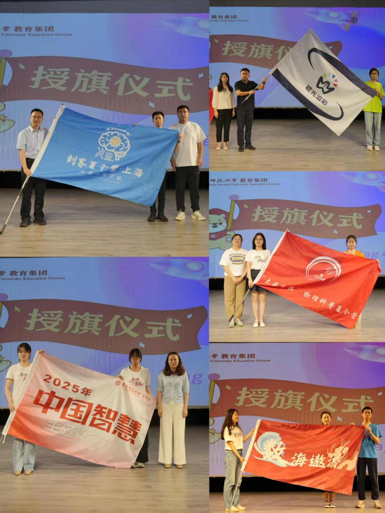 随后,进入到庄重而热烈的授旗环节。“硫光溢彩”化学营、“数海遨游”数学营、“大国重器”物理营、“哲韵飞扬”哲学营和“科技一夏,编码未来”软件编程营的营员代表精神抖擞地走上台,从院系领导手中郑重接过象征着责任与使命的营旗。这一面面营旗,不仅承载着深厚的学科精神内涵,更代表着青少年学子们向着学术高峰奋勇攀登的坚定信念与无畏勇气。授旗仪式结束后,各分营纷纷合影留念,用相机定格这一青春与梦想激情交汇的珍贵瞬间。