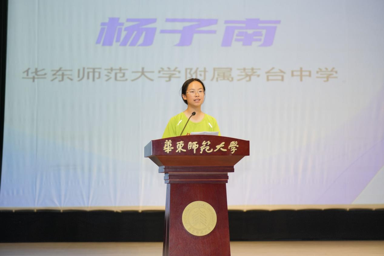 华东师大附属茅台中学学生杨子南在发言中,言辞恳切地表达了对华东师范大学的深深感激之情。她认为,此次夏令营为大家创造了极为难得的机会,不仅能够拓展自身视野,接触到更广阔的知识天地,还能勇敢挑战自我,突破自身局限,更重要的是结识来自五湖四海志同道合的伙伴,收获珍贵的友谊和学习机会。他号召全体营员,要以最饱满的热情全身心投入到接下来的学习与探索中,让“追求卓越”种子在心底深深扎根,在彼此的挑战与合作中不断收获成长与进步。